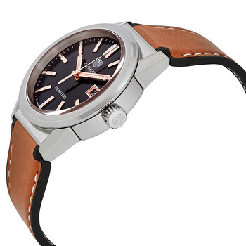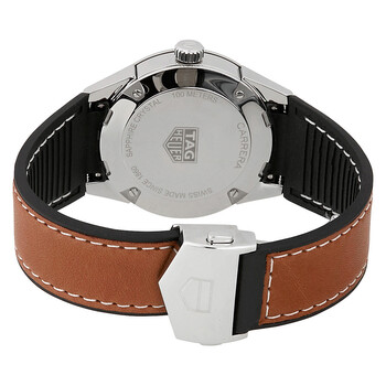 Sainless steel case with a brown leather (inner rubber) strap. Fixed stainless steel bezel. Black dial with luminous rose gold-tone hands and index hour markers. Minute markers around the outer rim. Dial Type: Analog. Luminescent hands and markers. Date display at the 3 o'clock position. Quartz movement. Scratch resistant sapphire crystal. Solid case back. Round case shape. Case size: 36 mm. Band length: 6 inches. Deployment clasp. Water resistant at 100 meters / 330 feet. Functions: date, hour, minute, second. Watch label: Swiss Made. Tag Heuer Carrera Black Dial Midsize Watch WBG1311.FT6116.