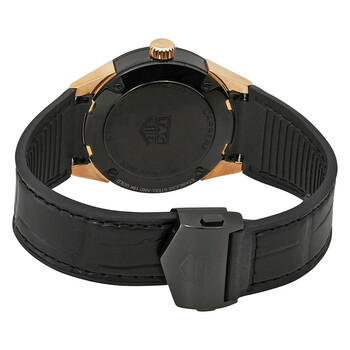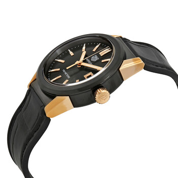 Black PVD stainless steel case with 18kt rose gold lugs with a black (alligator) leather (rubber backed) strap. Fixed black stainless steel bezel. Black dial with luminous rose gold-tone hands and index hour markers. Minute markers around the outer rim. Dial Type: Analog. Luminescent hands and markers. Date display at the 3 o'clock position. Quartz movement. Scratch resistant sapphire crystal. Pull / push crown. Solid case back. Round case shape. Case size: 36 mm. Push button release clasp. Water resistant at 100 meters / 330 feet. Functions: date, hour, minute, second. Casual watch style. Watch label: Swiss Made. Tag Heuer Carrera Black PVD Steel With 18kt Rose Gold Ladies Watch WBG1350.FC6418.