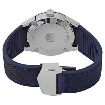 Stainless steel case with a blue rubber strap with a blue leather lining. Fixed stainless steel bezel. Blue sunray dial with luminous silver-tone hands and index hour markers. Minute markers around the outer rim. Dial Type: Analog. Luminescent hands and markers. Date display at the 3 o'clock position. Quartz movement. Scratch resistant sapphire crystal. Pull / push crown. Solid case back. Round case shape. Case size: 36 mm. Band length: 6 inches. Tang clasp. Water resistant at 100 meters / 330 feet. Functions: date, hour, minute, second. Additional Info: electrical current that causes the crystal to vibrate very consistently and at a very high frequency (32,768 times per second). Casual watch style. Watch label: Swiss Made. Tag Heuer Carrera Blue Dial Midsize Watch WBG1310.FT6115.