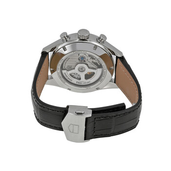 Stainless steel case with a black (alligator) leather strap. Fixed stainless steel bezel. Black dial with rose gold-tone hands and Arabic numeral hour markers. Minute markers around the outer rim. Dial Type: Analog. Luminescent hands and markers. Date display appears above the 6 o'clock position. Chronograph - three sub-dials displaying: 60 second, 30 minute and 12 hour. Automatic movement. Scratch resistant sapphire crystal. Pull / push crown. Skeleton case back. Case diameter: 43 mm. Case thickness: 16.2 mm. Round case shape. Band width: 22 mm. Fold over clasp with a safety release. Water resistant at 100 meters / 330 feet. Functions: chronograph, date, hour, minute, second. Dress watch style. Watch label: Swiss Made. Tag Heuer Carrera Calibre 1887 Chronograph Automatic Black Dial Men's Watch CAR2014.FC6235.