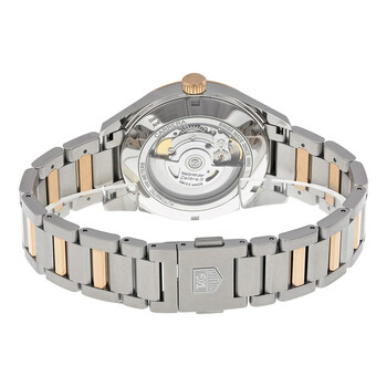 Stainless steel case with a stainless steel bracelet with 18kt rose gold links. Fixed 18kt rose gold bezel. Anthracite dial with luminous rose gold-tone hands and index hour markers. Minute markers around the outer rim. Dial Type: Analog. Luminescent hands and markers. Date display at the 3 o'clock position. TAG Heuer calibre 5 automatic movement, based upon ETA 2824-2, containing 26 Jewels, bitting at 28800 vph, and has a power reserve of approximately 38 hours. Scratch resistant sapphire crystal. Screw down crown. Transparent case back. Round case shape. Case size: 39 mm. Case thickness: 12 mm. Band width: 20.3 mm. Band length: 8 inches. Fold over clasp with a push button release. Water resistant at 100 meters / 330 feet. Functions: date, hour, minute, second. Additional Info: n general, suitable for swimming and snorkeling, but not scuba diving. Carrera Series. Dress watch style. Watch label: Swiss Made. Item Variations: WAR215E BD0784, WAR215E-BD0784, WAR215E/BD0784, WAR215EBD0784. Tag Heuer Carrera Calibre 5 Anthracite Dial Men's Watch WAR215EBD0784.