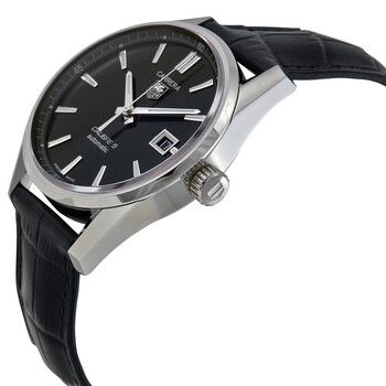 Stainless steel case with a black (alligator) leather strap. Fixed stainless steel bezel. Black dial with luminous silver-tone hands and index hour markers. Minute markers around the outer rim. Dial Type: Analog. Luminescent hands and markers. Date display at the 3 o'clock position. TAG Heuer calibre 5 automatic movement, based upon ETA 2824-2, containing 26 Jewels, bitting at 28800 vph, and has a power reserve of approximately 38 hours. Scratch resistant sapphire crystal. Pull / push crown. Skeleton case back. Round case shape. Case size: 39 mm. Case thickness: 13 mm. Band width: 20.3 mm. Band length: 8 inches. Deployment clasp. Water resistant at 100 meters / 330 feet. Functions: date, hour, minute, second. Carrera Calibre 5 Series. Luxury watch style. Watch label: Swiss Made. Item Variations: WAR211A FC6180, WAR211A-FC6180, WAR211A/FC6180, WAR211AFC6180. Tag Heuer Carrera Calibre 5 Black Dial Men's Watch WAR211AFC6180.