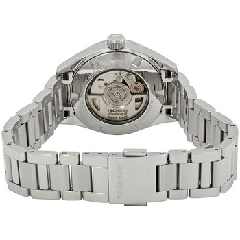 Stainless steel case with a stainless steel bracelet. Fixed stainless steel bezel. Blue dial with silver-tone hands and index hour markers. Dial Type: Analog. Luminescent hands and markers. Date display at the 3 o'clock position. Tag Heuer calibre 9 automatic movement, based upon Sellita SW1000-1, containing 18 Jewels, bitting at 28800 vph, and has a power reserve of approximately 40 hours. Scratch resistant sapphire crystal. Pull / push crown. Transparent case back. Round case shape. Case size: 28 mm. Case thickness: 11 mm. Band width: 14 mm. Band length: 8 inches. Fold over clasp with a push button release. Water resistant at 100 meters / 330 feet. Functions: date, hour, minute, second. Carrera Calibre 9 Series. Luxury watch style. Watch label: Swiss Made. Tag Heuer Carrera Calibre 9 Automatic Blue Dial Ladies Watch WAR2419.BA0776.