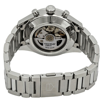 Stainless steel case with a stainless steel bracelet. Fixed stainless steel bezel. Black dial with luminous rhodium-plated hands and index hour markers. Minute markers around the outer rim. Dial Type: Analog. Luminescent hands and markers. Date display at the 3 o'clock position. Chronograph - three sub-dials displaying: 60 second, 30 minute and 12 hours. TAG Heuer calibre 16 automatic movement, based upon Valjoux 7750, containing 25 Jewels, bitting at 28800 vph, and has a power reserve of approximately 42 hours. Scratch resistant sapphire crystal. Pull / push crown. Transparent case back. Round case shape. Case size: 41 mm. Band width: 20 mm. Fold over clasp with a push button release. Water resistant at 100 meters / 330 feet. Functions: chronograph, date, hour, minute, second. Carrera Series. Luxury watch style. Watch label: Swiss Made. Tag Heuer Carrera Chronograph Automatic Black Dial Men's Watch CBK2110.BA0715.