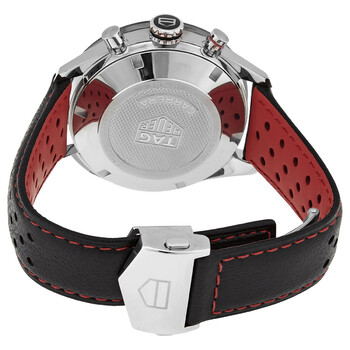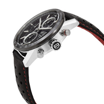 Silver-tone brushed/polished stainless steel case with a black leather strap. Fixed black ceramic bezel. Black dial with silver-tone hands and index hour markers. Tachymeter. Dial Type: Analog. Luminescent hands and markers. Date display at the 3 o'clock position. Chronograph - three sub-dials displaying: 60 second, 30 minute and 12 hours. Tag Heuer Calibre 16 Automatic movement, based upon Valjoux 7750, containing 25 Jewels, bitting at 28800 vph, and has a power reserve of approximately 42 hours. Scratch resistant sapphire crystal. Solid case back. Round case shape, case size: 41 mm. Folding clasp. Water resistant at 100 meters / 330 feet. Functions: chronograph, date, hour, minute, second. Carrera Series. Luxury watch style. Watch label: Swiss Made. Tag Heuer Carrera Chronograph Automatic Black Dial Men's Watch CBM2110.FC6454.