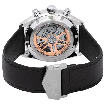 Silver-tone stainless steel case with a black leather strap. Fixed silver-tone stainless steel bezel. Black dial with silver-tone hands and index hour markers. Minute markers around the outer rim. Dial Type: Analog. Luminescent hands and markers. Date display at the 6 o'clock position. Chronograph - three sub-dials displaying: 60 second, 30 minute and 12 hour. Tag Heuer Calibre 02 Automatic movement, containing 33 Jewels, composed of 168 parts, bitting at 28800 vph, and has a power reserve of approximately 80 hours. Scratch resistant sapphire crystal. Transparent see through case back. Round case shape, case size: 42 mm. Deployment with push button release clasp. Water resistant at 100 meters / 330 feet. Functions: chronograph, column wheel, date, hour, minute, small second. Additional Info: original box, international warranty card, manual (complete accessories). Carrera Series. Luxury watch style. Watch label: Swiss Made. Tag Heuer Carrera Chronograph Automatic Black Dial Men's Watch CBN201C.FC6542.