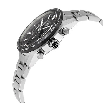 Stainless steel case with a stainless steel bracelet. Fixed black ceramic bezel showing tachymeter markings. Black dial with luminous silver-tone hands and index hour markers. Minute markers around the outer rim. Dial Type: Analog. Luminescent hands and markers. Date display at the 6 o'clock position. Chronograph - three sub-dials displaying: 60 second, 30 minute and 12 hour. Caliber Heuer 02 automatic movement with an 80-hour power reserve. Scratch resistant sapphire crystal. Pull / push crown. Transparent case back. Round case shape. Case size: 44 mm. Deployment clasp with a push button release. Water resistant at 100 meters / 330 feet. Functions: chronograph, tachymeter, date, hour, minute, second. Carrera Series. Luxury watch style. Watch label: Swiss Made. Tag Heuer Carrera Chronograph Automatic Black Dial Men's Watch CBN2A1B.BA0643.