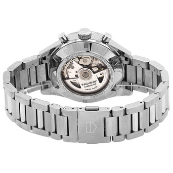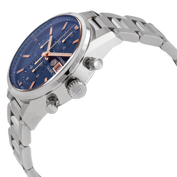 Silver-tone stainless steel case with a silver-tone stainless steel bracelet. Fixed silver-tone stainless steel bezel. Blue dial with rose gold-plated hands and index hour markers. Minute markers around the outer rim. Dial Type: Analog. Luminescent hands and markers. Big date display at the 3 o'clock position. Chronograph - three sub-dials displaying: 60 second, 30 minute and 12 hour. TAG Heuer Calibre 16 Automatic movement, based upon Valjoux 7750, containing 25 Jewels, bitting at 28800 vph, and has a power reserve of approximately 42 hours. Scratch resistant sapphire crystal. Pull / push crown. Transparent see through case back. Round case shape, case size: 41 mm. Band width: 20 mm. Deployment with push button release clasp. Water resistant at 100 meters / 330 feet. Functions: chronograph, big date, hour, minute, second. Carrera Series. Luxury watch style. Watch label: Swiss Made. Tag Heuer Carrera Chronograph Automatic Blue Dial Men's Watch CBK2115.BA0715.