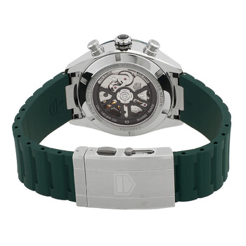 Silver-tone stainless steel case with a green rubber strap. Fixed green stainless steel bezel. Green circular brushed dial with silver-tone hands and index hour markers. Tachymeter scale around the outer rim. Dial Type: Analog. Luminescent hands and markers. Date display at the 6 o'clock position. Chronograph - three sub-dials displaying: 60 second, 30 minute and 12 hour. Heuer Calibre 02 Automatic movement, containing 33 Jewels, composed of 168 parts, bitting at 28800 vph, and has a power reserve of approximately 75 hours. Scratch resistant sapphire crystal. Transparent see through case back. Round case shape, case size: 44 mm. Water resistant at 100 meters / 330 feet. Functions: chronograph, column wheel, date, hour, minute, small second, chronometer. Carrera Chronograph Series. Luxury watch style. Watch label: Swiss Made. Tag Heuer Carrera Chronograph Automatic Chronometer Men's Watch CBN2A1N.FT6238.