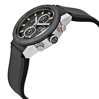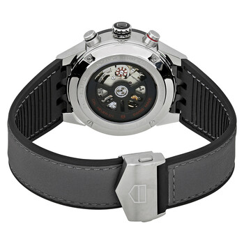 Silver-tone stainless steel case with a black rubber strap. Fixed black ceramic bezel. Black dial with luminous silver-tone hands and index hour markers. Minute markers around the outer rim, tachymeter on bezel. Dial Type: Analog. Luminescent hands and markers. Date display at the 3 o'clock position. Chronograph - three sub-dials displaying: 60 second, 30 minute and 12 hours. Tag Heuer Calibre 01 automatic movement with a 50-hour power reserve. Scratch resistant sapphire crystal. Transparent case back. Round case shape. Case size: 43 mm. Band width: 25 mm. Fold over with push buttons clasp. Water resistant at 100 meters / 330 feet. Functions: chronograph, tachymeter, date, hour, minute, second. Additional Info: power reserve is 40 hours with chronograph operating. Sport watch style. Watch label: Swiss Made. Tag Heuer Carrera Chronograph Automatic Men's Watch CAR201W.FT6095.