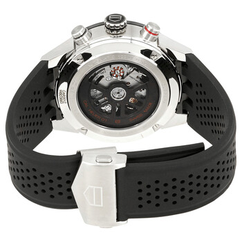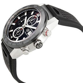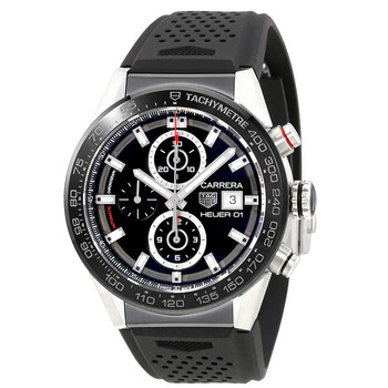 Stainless steel case with a black rubber strap. Fixed black ceramic bezel showing tachymeter markings bezel. Black dial with luminous silver-tone hands and index hour markers. Minute markers around the outer rim. Dial Type: Analog. Luminescent hands and markers. Date display at the 3 o'clock position. Chronograph - three sub-dials displaying: 60 second, 30 minute and 12 hour. TAG Heuer Calibre 01 Automatic movement, based upon TAG Heuer calibre 1887, containing 39 Jewels, bitting at 28800 vph, and has a power reserve of approximately 50 hours. Scratch resistant sapphire crystal. Pull / push crown. Transparent case back. Round case shape. Case size: 43 mm. Case thickness: 17 mm. Band width: 24 mm. Deployment clasp with a push button release. Water resistant at 100 meters / 330 feet. Functions: chronograph, date, hour, minute, second, tachymeter. Carrera Series. Luxury watch style. Watch label: Swiss Made. Tag Heuer Carrera Chronograph Automatic Men's Watch CAR201Z.FT6046.