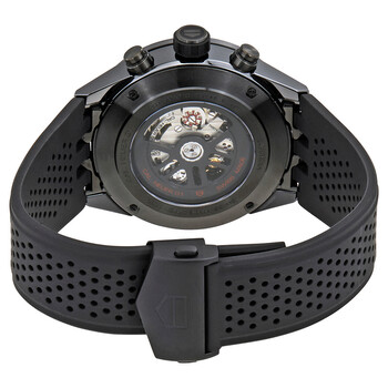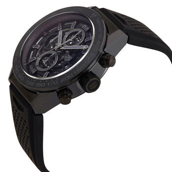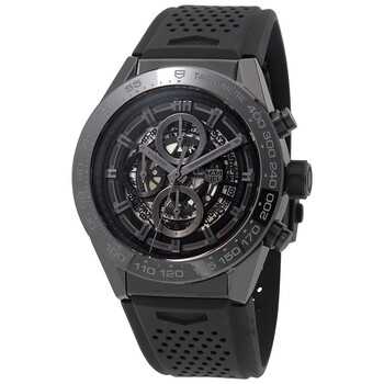 Black ceramic case with a black rubber strap. Uni-directional rotating black ceramic showing tachymeter markings bezel. Skeleton dial with luminous grey hands and index hour markers. Minute markers around the outer rim. Dial Type: Analog. Luminescent hands and markers. Date display between the 4 and 5 o'clock positions. Chronograph - three sub-dials displaying: 60 seconds, 30 minutes, and 12 hours. Tag Heuer calibre 01 automatic movement with a 50-hour power reserve. Scratch resistant sapphire crystal. Pull / push crown. Transparent case back. Round case shape, case size: 45 mm, case thickness: 16.5mm. Deployment clasp with a push button release. Water resistant at 100 meters / 330 feet. Functions: chronograph, date, hour, minute, second, tachymeter. Luxury watch style. Watch label: Swiss Made. Tag Heuer Carrera Chronograph Automatic Men's Watch CAR2A90.FT6071.