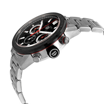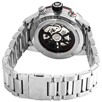 Stainless steel case with a stainless steel bracelet. Fixed stainless steel bezel with a black ring showing tachymeter markings. Skeleton dial with luminous silver-tone hands and index hour markers. Minute markers around the outer rim. Dial Type: Analog. Luminescent hands and markers. Date display between the 4 and 5 o'clock positions. Chronograph - three sub-dials displaying: second, 30 minute and 12 hour. Tag Heuer calibre 02 automatic movement, containing 33 Jewels, composed of 168 parts, bitting at 28800 vph, and has a power reserve of approximately 80 hours. Scratch resistant sapphire crystal. Pull / push crown. Transparent case back. Round case shape. Case size: 43 mm. Deployment clasp with a push button release. Water resistant at 100 meters / 330 feet. Functions: chronograph, date, hour, minute, second. Carrera Series. Sport watch style. Watch label: Swiss Made. Tag Heuer Carrera Chronograph Automatic Men's Watch CBG2010.BA0662.
