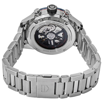 Stainless steel case with a stainless steel bracelet. Fixed stainless steel bezel with a blue ceramic ring showing tachymeter markings. Skeleton dial with luminous silver-tone hands and index hour markers. Minute markers around the outer rim. Dial Type: Analog. Luminescent hands and markers. Date display between the 4 and 5 o'clock positions. Chronograph - three sub-dials displaying: 60 second, 30 minute and 12 hours. Tag Heuer calibre 02 automatic movement, containing 33 Jewels, composed of 168 parts, bitting at 28800 vph, and has a power reserve of approximately 80 hours. Scratch resistant sapphire crystal. Pull / push crown. Transparent case back. Round case shape. Case size: 43 mm. Band width: 22 mm. Fold over clasp. Water resistant at 100 meters / 330 feet. Functions: chronograph, tachymeter, date, hour, minute, second. Sport watch style. Watch label: Swiss Made. Tag Heuer Carrera Chronograph Automatic Men's Watch CBG2011.BA0662.