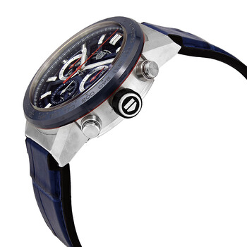 Silver-tone fine-brushed/polished stainless steel case with a blue alligator leather/ rubber strap. Fixed blue ceramic bezel. Skeleton dial with silver-tone hands and index hour markers. Tachymeter. Dial Type: Analog. Luminescent hands and markers. Date display between 4 and 5 o'clock position. Chronograph - three sub-dials displaying: 60 second, 30 minute and 12 hours. Tag Heuer Calibre HEUER02 automatic movement with an 80-hour power reserve. Scratch resistant sapphire crystal. Pull / push crown. Transparent see through case back. Round case shape, case size: 43 mm. Folding clasp. Water resistant at 100 meters / 330 feet. Functions: chronograph, date, hour, minute, second. Carrera Series. Watch label: Swiss Made. Tag Heuer Carrera Chronograph Automatic Men's Watch CBG2011.FC6430.