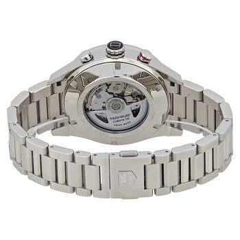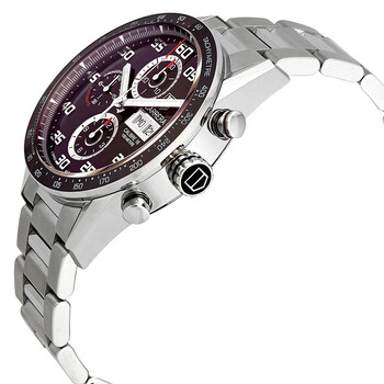 Silver-tone stainless steel case with a silver-tone stainless steel bracelet. Fixed tachymeter scale silver-tone stainless steel with a brown ceramic top ring bezel. Brown dial with silver-tone hands and Arabic numeral hour markers. Minute markers around the outer rim. Dial Type: Analog. Luminescent hands. Day of the week and date display at the 3 o'clock position. Chronograph - three sub-dials displaying: 60 seconds, 30 minutes and 12 hours. TAG Heuer Calibre 16 Automatic movement, based upon Valjoux 7750, containing 25 Jewels, bitting at 28800 vph, and has a power reserve of approximately 42 hours. Scratch resistant sapphire crystal. Transparent case back. Round case shape, case size: 43 mm. Band width: 22 mm. Deployment clasp. Water resistant at 100 meters / 330 feet. Functions: chronograph, date, day, hour, minute, small second. Carrera Series. Luxury watch style. Watch label: Swiss Made. Tag Heuer Carrera Chronograph Automatic Men's Watch CV2A1S.BA0799.