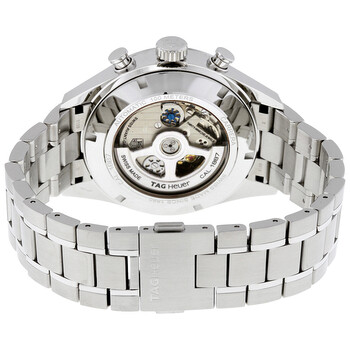 Stainless steel case with a stainless steel bracelet. Fixed stainless steel bezel. Silver dial with luminous rose gold-tone hands and Arabic numeral hour markers. Minute markers around the outer rim. Dial Type: Analog. Luminescent hands and markers. Date display at the 6 o'clock position. Chronograph - three sub-dials displaying: 60 second, 30 minute and 12 hour. Tag Heuer calibre 1887 automatic movement with a 50-hour power reserve. Scratch resistant sapphire crystal. Pull / push crown. Skeleton case back. Round case shape. Case size: 43 mm. Case thickness: 16 mm. Band width: 20 mm. Deployment clasp with a push button release. Water resistant at 100 meters / 330 feet. Functions: chronograph, column wheel, date, hour, minute, small second. Luxury watch style. Watch label: Swiss Made. Item Variations: CAR2012 BA0796, CAR2012-BA0796, CAR2012/BA0796, CAR2012BA0796. Tag Heuer Carrera Chronograph Automatic Silver Dial Men's Watch CAR2012.BA0796.