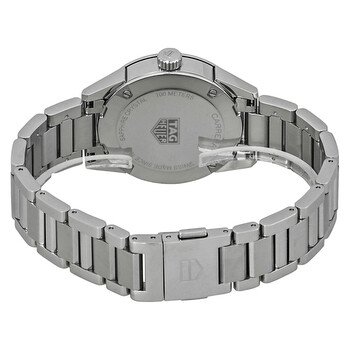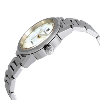 Polished stainless steel case with a stainless steel bracelet. Fixed stainless steel bezel. Mother of pearl dial with luminous silver-tone hands and diamond hour markers. Dial Type: Analog. Luminescent hands. Date display at the 3 o'clock position. Quartz movement. Scratch resistant sapphire crystal. Pull / push crown. Solid case back. Round case shape. Case size: 36 mm. Band width: 18 mm, band length: 6 inches. Fold over clasp with a safety release. Water resistant at 100 meters / 330 feet. Functions: date, hour, minute, second. Additional Info: 13 diamond set on dial (0.13 ct). Dress watch style. Watch label: Swiss Made. Tag Heuer Carrera Diamond Mother of Pearl Dial Ladies Watch WBG1312.BA0758.