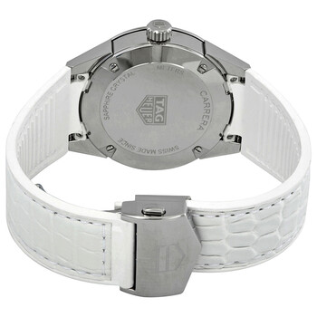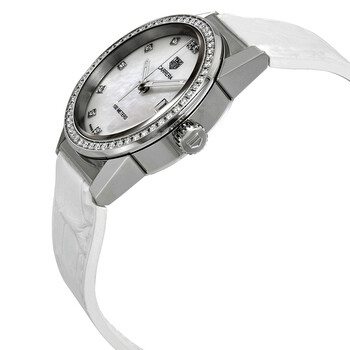 Silver-tone stainless steel case with a white alligator rubber/leather strap. Fixed silver-tone diamond set bezel. White mother of pearl dial with rhodium-plated hands and diamond hour markers. Dial Type: Analog. Luminescent hands. Date display at the 3 o'clock position. Quartz movement. Scratch resistant sapphire crystal. Solid case back. Round case shape. Case size: 36 mm. Water resistant at 100 meters / 330 feet. Functions: date, hour, minute, second. Additional Info: case set with 54 diamonds (0.72 ct), 13 diamond set on dial (0.13 ct). Dress watch style. Watch label: Swiss Made. Tag Heuer Carrera Diamond Mother of Pearl Dial Ladies Watch WBG1315.FC6412.