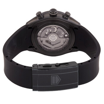 Black DLC titanium case with a black rubber strap. Fixed tachymeter scale black DLC titanium bezel. Black dial with silver-tone hands and index hour markers. Minute markers around the outer rim. Dial Type: Analog. Luminescent hands and markers. Date display at the 6 o'clock position. Chronograph - three sub-dials displaying: 1/4 second, 30 minute and 12 hour. Tag Heuer Calibre TH20-00 automatic movement with an 80-hour power reserve. Scratch resistant sapphire crystal. Transparent see through case back. Round case shape, case size: 44 mm, case thickness: 15.1 mm. Band width: 22.1 mm. Folding clasp. Water resistant at 100 meters / 330 feet. Functions: chronograph, date, hour, minute, second. Carrera Series. Sport watch style. Watch label: Swiss Made. Tag Heuer Carrera Extreme Sport Chronograph Automatic Black Dial Watch CBU2080.FT6272.