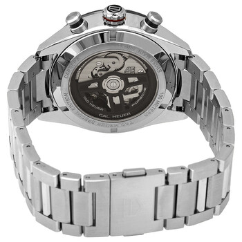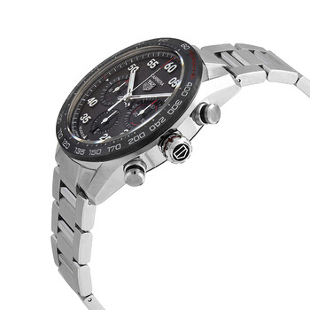Stainless steel case with a stainless steel bracelet. Fixed black ceramic bezel showing tachymeter markings. Grey dial with luminous silver-tone hands. Arabic numeral minute markers (at 5 minute intervals). Minute markers around the outer rim. Dial Type: Analog. Luminescent hands and markers. Date display at the 6 o'clock position. Chronograph - three sub-dials displaying: 60 second, 30 minute and 12 hours. Tag Heuer calibre HEUER02 automatic movement with an 80-hour power reserve. Scratch resistant sapphire crystal. Pull / push crown. Transparent case back. Round case shape. Case size: 44 mm. Fold over clasp with a push button release. Water resistant at 100 meters / 330 feet. Functions: chronograph, tachymeter, date, hour, minute, second. Carrera Porsche Special Edition Series. Casual watch style. Watch label: Swiss Made. Tag Heuer Carrera Porsche Special Edition Chronograph Automatic Grey Dial Men's Watch CBN2A1F.BA0643.
