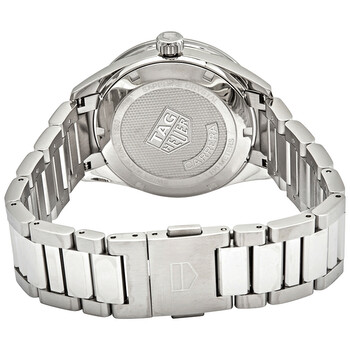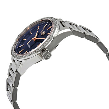 Stainless steel case with a stainless steel bracelet. Fixed stainless steel bezel set with 54 diamonds. Blue dial with rose gold-tone hands and index hour markers. Minute markers around the outer rim. Dial Type: Analog. Date display at the 3 o'clock position. Quartz movement. Scratch resistant sapphire crystal. Pull / push crown. Solid case back. Round case shape. Case size: 36 mm. Fold over clasp with a push button release. Water resistant at 100 meters / 330 feet. Functions: date, hour, minute, second. Carrera Series. Luxury watch style. Watch label: Swiss Made. Tag Heuer Carrera Quartz Blue Dial Ladies Watch WBK1317.BA0652.