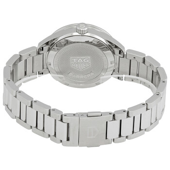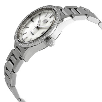 Stainless steel case with a stainless steel bracelet. Fixed stainless steel bezel set with 54 diamonds. White mother of pearl dial with silver-tone dauphine-style shape hands and index hour markers. Minute markers around the outer rim. Dial Type: Analog. Date display at the 3 o'clock position. Quartz movement. Scratch resistant sapphire crystal. Pull / push crown. Solid case back. Round case shape. Case size: 36 mm. Fold over clasp with a push button release. Water resistant at 100 meters / 330 feet. Functions: date, hour, minute, second. Carrera Series. Dress watch style. Watch label: Swiss Made. Tag Heuer Carrera Quartz Diamond White Mother of Pearl Dial Ladies Watch WBK1316.BA0652.