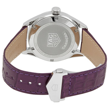 Stainless steel case with a purple (alligator) leather strap. Fixed stainless steel bezel. White mother of pearl dial with silver-tone hands and index hour markers. Minute markers around the outer rim. Dial Type: Analog. Date display at the 3 o'clock position. Quartz movement. Scratch resistant sapphire crystal. Pull / push crown. Solid case back. Round case shape. Case size: 36 mm. Deployment clasp. Water resistant at 100 meters / 330 feet. Functions: date, hour, minute, second. Luxury watch style. Watch label: Swiss Made. Tag Heuer Carrera Quartz White Mother of Pearl Dial Ladies Watch WBK1311.FC8261.