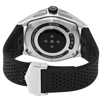 Silver-tone stainless steel case with a black rubber strap. Fixed black ceramic bezel. Silver-tone hands and index hour markers. Minute markers around the outer rim. Dial Type: Analog-digital. Date display between 4 and 5 o'clock position. Tag Heuer Calibre E4 digital movement. Scratch resistant sapphire crystal. Round case shape, case size: 45 mm, case thickness: 13.6 mm. Folding clasp. Water resistant at 50 meters / 165 feet. Functions: date, hour, minute, second. Connected Series. Sport watch style. Tag Heuer Connected Analog-Digital Men's Smart Watch SBR8A10.BT6259.