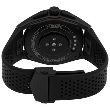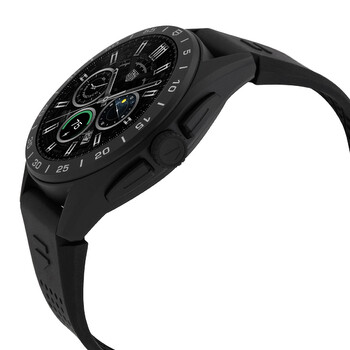 Black titanium case with a black rubber strap. Fixed black ceramic bezel. Silver-tone hands and index hour markers. Minute markers around the outer rim. Dial Type: Analog-digital. Date display between 4 and 5 o'clock position. Tag Heuer Calibre E4. Scratch resistant sapphire crystal. Round case shape, case size: 45 mm, case thickness: 15.2 mm. Buckle clasp. Water resistant at 50 meters / 165 feet. Functions: date, hour, minute, second. Connected Series. Sport watch style. Tag Heuer Connected Analog-Digital Men's Smart Watch SBR8A80.BT6261.