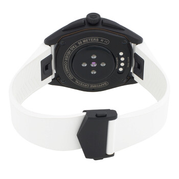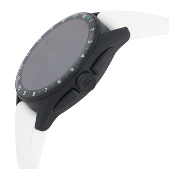 Black titanium case with a white rubber strap. Fixed black titanium bezel. Black dial with silver-tone hands and index hour markers. Minute markers around the outer rim. Dial Type: Analog-digital. Luminescent hands and markers. Date display between 4 and 5 o'clock position. Quartz movement. Scratch resistant sapphire crystal. Solid case back. Round case shape, case size: 42 mm, case thickness: 13.9 mm. Folding clasp. Water resistant at 50 meters / 165 feet. Functions: date, hour, minute, second, heart rate, compass, microphone, barometer, wi-fi, Bluetooth 5.0, nfc, gnss. Additional Info: wear os by google. android 8.0 + (excluding go edition) / ios 15.0 +. Connected Golf Edition Series. Sport watch style. Tag Heuer Connected Golf Edition Quartz Analog-Digital Black Dial Men's Watch SBR8080.EB0284.