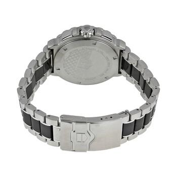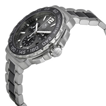Stainless steel case with a stainless steel bracelet with black ceramic center links. Fixed black ceramic bezel with tachymeter. Anthracite sunray dial with silver-tone hands and index hour markers. Minute markers around the outer rim. Dial Type: Analog. Luminescent hands and markers. Date display at the 4 o'clock position. Chronograph - three sub-dials displaying: 60 second, 30 minute and 1/10th of a second. Quartz movement. Scratch resistant sapphire crystal. Screw down crown. Solid case back. Case diameter: 42 mm. Case thickness: 12 mm. Round case shape. Band width: 20 mm. Deployment clasp with push button release. Water resistant at 200 meters / 660 feet. Functions: chronograph, date, hour, minute, second. Casual watch style. Watch label: Swiss Made. Tag Heuer Formula 1 Anthracite Sunray Dial Men's Watch CAU1115.BA0869.