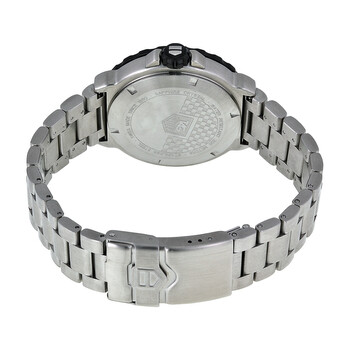 Stainless steel case with a stainless steel bracelet. Uni-directional rotating black titanium carbide bezel. Black dial with luminous hands and index hour markers. Arabic numerals app[ear at the 12 o'clock position. Arabic numeral minute markers (at 5 minute intervals). Minute markers around the outer rim. Dial Type: Analog. Luminescent hands and markers. Date display between the 4 and 5 o'clock positions. Small seconds sub-dial at the 6 o'clock position. Quartz movement. Scratch resistant sapphire crystal. Screw down crown. Solid case back. Round case shape. Case size: 42 mm. Case thickness: 12.5 mm. Band width: 20 mm. Band length: 8.5 inches. Fold over clasp with a safety release. Water resistant at 200 meters / 660 feet. Functions: date, hour, minute, second. Formula 1 Series. Sport watch style. Watch label: Swiss Made. Item Variations: WAU1114 BA0858, WAU1114-BA0858, WAU1114/BA0858, WAU1114BA0858. Tag Heuer Formula 1 Black Dial Steel Men's Watch WAU1114.BA0858.