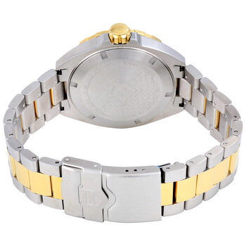 Fine-brushed and polished stainless steel case with a two-tone (silver and yellow gold PVD) stainless steel bracelet. Uni-directional rotating yellow gold PVD bezel with an inlaid black ring. Black dial with luminous gold-tone hands and index hour markers. Arabic numerals mark the 6 and 12 o'clock positions. Minute markers around the outer rim. Dial Type: Analog. Luminescent hands and markers. Date display at the 3 o'clock position. Quartz movement. Scratch resistant sapphire crystal. Screw down crown. Solid case back. Case size: 41 mm. Case thickness: 12 mm. Round case shape. Deployment clasp. Water resistant at 200 meters / 660 feet. Functions: date, hour, minute, second. Luxury watch style. Watch label: Swiss Made. Tag Heuer Formula 1 Black Dial Two-tone Men's Watch WAZ1121.BB0879.