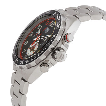 Silver-tone stainless steel case and bracelet. Fixed tachymeter scale black bezel. Black dial with silver-tone hands and Arabic numeral hour markers. Minute markers around the outer rim. Dial Type: Analog. Luminescent hands and markers. Date display at the 4 o'clock position. Chronograph - three sub-dials displaying: 60 second, 30 minute and 1/10th of a second. Quartz movement. Scratch resistant sapphire crystal. Solid case back. Round case shape, case size: 43 mm. Fold over clasp with a safety release. Water resistant at 200 meters / 660 feet. Functions: chronograph, date, hour, minute, second. Additional Info: original box, international warranty card, manual (complete accessories). Formula 1 Series. Luxury watch style. Watch label: Swiss Made. Tag Heuer Formula 1 Chronograph Quartz Black Dial Men's Watch CAZ101AW.BA0842.