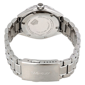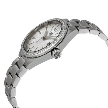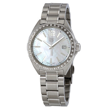 Stainless steel case with a stainless steel bracelet. Fixed stainless steel bezel set with 36 diamonds. White mother of pearl dial with silver-tone hands and index hour markers. An Arabic numeral appears at the 12 o'clock position. Minute markers around the outer rim. Dial Type: Analog. Date display at the 3 o'clock position. Quartz movement. Scratch resistant sapphire crystal. Solid case back. Round case shape. Case size: 35 mm. Bracelet width: 20 mm. Fold over clasp. Water resistant at 100 meters / 330 feet. Functions: date, hour, minute, second. Additional Info: set of 36 diamonds on bezel. Dress watch style. Watch label: Swiss Made. Tag Heuer Formula 1 Diamond White Mother of Pearl Dial Ladies Watch WBJ131A.BA0666.
