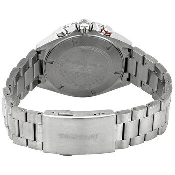 Stainless steel case with a stainless steel bracelet. Fixed stainless steel bezel with a blue aluminium ring showing tachymeter markingsl. Blue dial with luminous silver-tone hands and Arabic numeral hour markers. Minute markers around the outer rim. Dial Type: Analog. Luminescent hands and markers. Date display at the 4 o'clock position. Chronograph - three sub-dials displaying: 60 second, 30 minute and 1/10th of a second. Ronda caliber 5040.D quartz movement. Scratch resistant sapphire crystal. Solid case back. Round case shape. Case size: 43 mm. Deployment clasp. Water resistant at 200 meters / 660 feet. Functions: chronograph, tachymeter, date, hour, minute, second. Formula 1 X Red Bull Racing Special Edition Series. Casual watch style. Watch label: Swiss Made. Tag Heuer Formula 1 X Red Bull Racing Special Edition Chronograph Quartz Blue Dial Men's Watch CAZ101AL.BA0842.