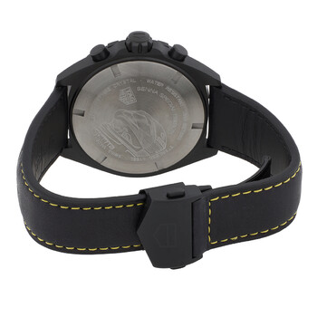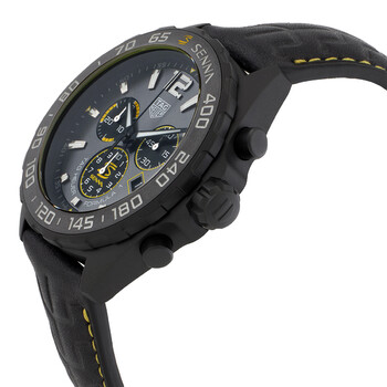 Black DLC stainless steel case with a black leather strap. Fixed black DLC bezel with an inlaid black ceramic ring. Grey dial with luminous black hands and index hour markers. Arabic numeral appears at the 12 o'clock position. Arabic numeral minute markers (at 5 minute intervals). Minute markers around the outer rim. Dial Type: Analog. Luminescent hands and markers. Date display at the 4 o'clock position. Chronograph - three sub-dials displaying: 60 second, 30 minute and 1/10th of a second. Quartz movement. Scratch resistant sapphire crystal. Screw down crown. Solid case back. Round case shape. Case size: 43 mm. Deployment clasp with a push button release. Water resistant at 200 meters / 660 feet. Functions: chronograph, date, hour, minute, second. Additional Info: original box, manual (complete accessories). Formula 1 X Senna Series. Luxury watch style. Watch label: Swiss Made. Tag Heuer Formula 1 X Senna Chronograph Quartz Grey Dial Men's Watch CAZ101AJ-FC6487.