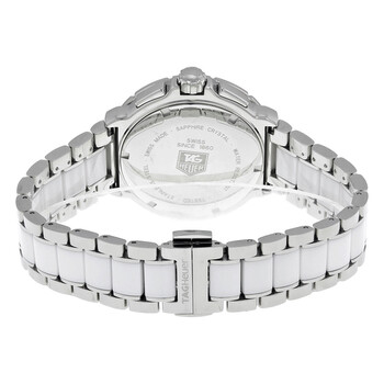 Stainless steel case with a stainless steel bracelet with white ceramic center links. Uni-directional rotating silver-tone bezel with a white ceramic top ring. White ceramic dial with luminous silver-tone hands and diamond hour markers. Minute markers around the outer rim. Dial Type: Analog. Luminescent hands. Date display between the 4 and 5 o'clock positions. Chronograph - two sub-dials displaying: 60 seconds and 30 minutes. Quartz movement. Scratch resistant sapphire crystal. Screw down crown. Solid case back. Case size: 41 mm. Case thickness: 12.5 mm. Round case shape. Band width: 20 mm. Band length: 8 inches. Fold over clasp. Water resistant at 200 meters / 660 feet. Functions: hours, minutes, seconds, calendar, chronograph. Dress watch style. Watch label: Swiss Made. Item Variations: CAH1211-BA0863, CAH1211BA0863, CAH1211/BA0863, CAH1211 BA0863. Tag Heuer Formula One Ceramic Ladies Watch CAH1211BA0863.