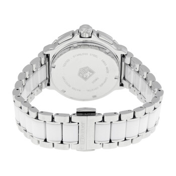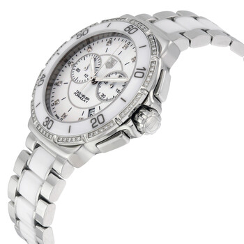 Stainless steel case with a stainless steel bracelet with white ceramic center links. Fixed stainless steel bezel with a white ceramic top ring set with diamonds. White ceramic dial with luminous hands and white diamond hour markers. Minute markers around the outer rim. Luminescent hands and markers. Date display between the 4 and 5 o'clock positions. Chronograph - two sub-dials displaying: 60 seconds and 30 minutes. Battery operated quartz movement. Scratch resistant sapphire crystal. Screw down crown. Screw down solid case back. Case diameter: 41 mm. Case thickness: 11.3 mm. Deployment clasp. Water resistant at 200 meters / 660 feet. Tag Heuer Formula 1 Ceramic Watch CAH1213BA0863.