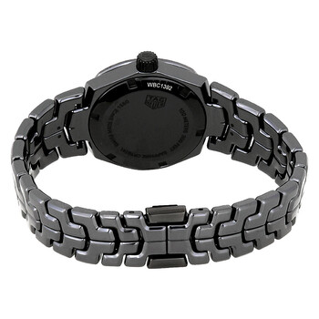 Black ceramic case with a black ceramic bracelet. Fixed black ceramic bezel. Black mother of pearl dial with rose gold-tone dauphine-style shape hands and index hour markers. Minute markers around the outer rim. Dial Type: Analog. Date display at the 3 o'clock position. Quartz movement. Scratch resistant sapphire crystal. Pull / push crown. Solid case back. Round case shape. Case size: 32 mm. Band width: 14 mm. Hidden clasp. Water resistant at 100 meters / 330 feet. Functions: date, hour, minute, second. Dress watch style. Watch label: Swiss Made. Tag Heuer Link Black Mother of Pearl Dial Ladies Watch WBC1392.BH0744.