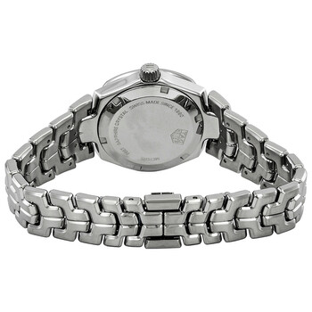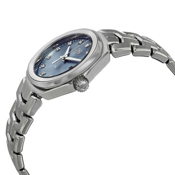 Stainless steel case with a stainless steel bracelet. Fixed stainless steel bezel. Blue mother of pearl dial with silver-tone hands and diamond hour markers. Minute markers around the outer rim. Dial Type: Analog. Date display at the 3 o'clock position. Quartz movement. Scratch resistant sapphire crystal. Pull / push crown. Solid case back. Round case shape. Case size: 32 mm. Case thickness: 10 mm. Band width: 19 mm. Fold over clasp with a push button release. Water resistant at 100 meters / 330 feet. Functions: date, hour, minute, second. Link Series. Dress watch style. Watch label: Swiss Made. Tag Heuer Link Diamond Ladies Watch WBC1313.BA0600.