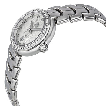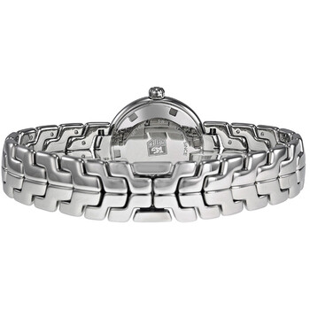 Stainless steel case with a stainless steel bracelet. Fixed stainless steel bezel set with 47 diamonds. Silver (S-shape) guilloche dial with silver-tone hands and diamond hour markers. Dial Type: Analog. Luminescent hands. Date display appears at the 6 o'clock position. Quartz movement. Scratch resistant sapphire crystal. Screw down crown. Solid case back. Case diameter: 29 mm. Case thickness: 9.6 mm. Round case shape. Bracelet width: 20 mm. Deployment clasp with a push button release. Water resistant at 100 meters / 330 feet. Functions: date, hour, minute, second. Luxury watch style. Watch label: Swiss Made. Tag Heuer Link Diamond Silver Guilloche Steel Ladies Watch WAT1414.BA0954.
