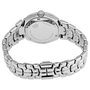 Stainless steel case with a stainless steel bracelet. Fixed stainless steel bezel set with diamonds. Black dial with rose gold-tone hands and diamond hour markers. Dial Type: Analog. Date display at the 3 o'clock position. Quartz movement. Scratch resistant sapphire crystal. Screw down crown. Solid case back. Round case shape. Case size: 32 mm. Fold over clasp with a push button release. Water resistant at 100 meters / 330 feet. Functions: date, hour, minute, second. Link Series. Dress watch style. Watch label: Swiss Made. Tag Heuer Link Quartz Diamond Black Dial Ladies Watch WBC131G.BA0649.
