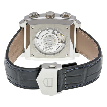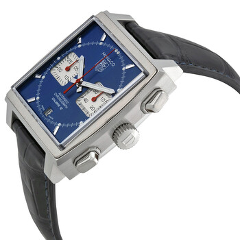 Stainless steel case with a blue (alligator) leather strap. Fixed stainless steel bezel. Blue dial with luminous silver-tone hands and index hour markers. Minute markers around an inner ring. Dial Type: Analog. Luminescent hands and dial markers. Date display at the 6 o'clock position. Chronograph - two sub-dials displaying: 60 seconds and 30 minutes. Tag Heuer calibre 12 automatic movement with a 40-hour power reserve. Scratch resistant sapphire crystal. Screw down crown. Skeleton case back. Square case shape. Case size: 39 mm. Case thickness: 14 mm. Band width: 22 mm. Band length: 9 inches. Deployment clasp. Water resistant at 100 meters / 330 feet. Functions: chronograph, date, hour, minute, second. Additional Info: calibre 12. Luxury watch style. Watch label: Swiss Made. Item Variations: CAW2111-FC6183, CAW2111FC6183, CAW2111/FC6183, CAW2111 FC6183. Tag Heuer Monaco Calibre 12 Men's Watch CAW2111.FC6183.