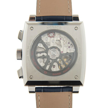 Silver-tone stainless steel case with a blue (alligator) leather strap. Fixed silver-tone stainless steel bezel. Blue sunray dial with luminous silver-tone hands and index hour markers. Minute markers. Dial Type: Analog. Luminescent hands and markers. Date display at the 6 o'clock position. Chronograph - three sub-dials displaying: 60 second, 30 minute and 12 hour. Calibre HEUER02 automatic movement with an 80-hour power reserve. Scratch resistant sapphire crystal. Pull / push crown. Transparent case back. Square case shape, case size: 39 mm x 39 mm. Band width: 22mm. Fold over clasp. Water resistant at 100 meters / 330 feet. Functions: chronograph, date, hour, minute, second. Monaco Series. Luxury watch style. Watch label: Swiss Made. Tag Heuer Monaco Chronograph Automatic Blue Sunray Dial Men's Watch CBL2111.FC6453.