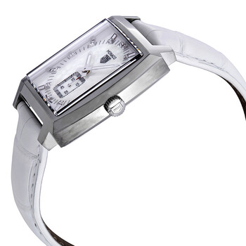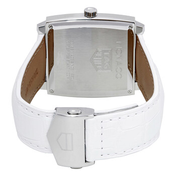 Stainless steel case with a white (alligator) leather strap. Fixed stainless steel bezel. Mother of pearl dial with luminous rhodium-plated hands and diamond-tipped index hour markers. Minute markers. Dial Type: Analog. Date display at the 3 o'clock position. Small seconds sub-dial at the 6 o'clock position. Quartz movement. Scratch resistant sapphire crystal. Pull / push crown. Solid case back. Square case shape, case size: 37 mm, case thickness: 13 mm. Fold over with push button release clasp. Water resistant at 100 meters / 330 feet. Functions: date, hour, minute, second. Additional Info: 13 vs diamonds diameter 1.30 mm (0.10 ct). Dress watch style. Watch label: Swiss Made. Tag Heuer Monaco Mother of Pearl Diamond Dial Men's Watch WAW131B.FC6247.