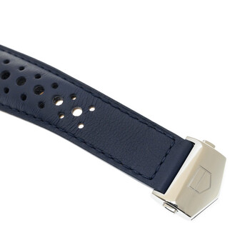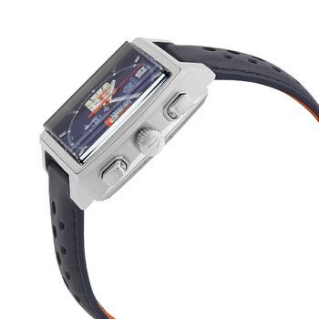 Silver-tone stainless steel case with a blue leather strap. Fixed silver-tone stainless steel bezel. Blue dial with silver-tone hands and index hour markers. Minute markers around the outer rim. Dial Type: Analog. Luminescent hands and markers. Date display at the 6 o'clock position. Chronograph - two sub-dials displaying: 12 hour and 30 minute. Tag Heuer Calibre 02 Automatic movement, containing 33 Jewels, composed of 168 parts, bitting at 28800 vph, and has a power reserve of approximately 80 hours. Scratch resistant sapphire crystal. Transparent see through case back. Square case shape, case size: 39 mm. Deployment with push button release clasp. Water resistant at 100 meters / 330 feet. Functions: chronograph, date, hour, minute, second. Monaco X Gulf Series. Luxury watch style. Watch label: Swiss Made. Tag Heuer Monaco X Gulf Chronograph Automatic Blue Dial Men's Watch CBL2115.FC6494.