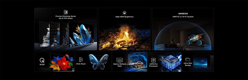 - AiPQ Pro პროცესორი და Dolby Atmos უზრუნველყოფს კადრის გლუვ ცვლილებას და ხმასთან სინქრონიზაციას