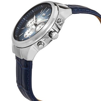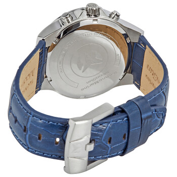 Stainless steel case with a blue leather strap. Fixed stainless steel bezel. Blue dial with luminous silver-tone hands and index hour markers. Minute markers around the outer rim. Dial Type: Analog. Luminescent hands and markers. Date display above the 6 o'clock position. Chronograph - three sub-dials displaying: 60 second, 60 minute and 24 hours. Quartz movement. Scratch resistant Flame Fusion crystal. Pull / push crown. Solid case back. Round case shape. Case size: 42 mm. Case thickness: 10 mm. Band width: 24 mm. Tang clasp. Water resistant at 50 meters / 165 feet. Functions: chronograph, date, hour, minute, second. Sport watch style. Technomarine Chronograph Quartz Blue Dial Men's Watch TM-820013.